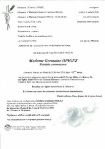 Madame Germaine OPIGEZ Marles-les-Mines Décédée le 20 février 2026 à Marles-les-Mines Laisser un message de condoléances Cliquer pour agrandir Envoyer mes condoléances * indique les champs nécessaires Vos coordonnées Prénom* Nom* Votre adresse Adresse postale* Ville* Code postal* Votre numéro de téléphone Votre e-mail* Message de condoléances Votre message de condoléances* Photo (optionnel) Formats acceptés : JPG, PNG (max 10MB) J'accepte que ce message soit traité conformément à la politique de confidentialité.* Pour toute commande de fleurs : 03 21 62 49 42 ×